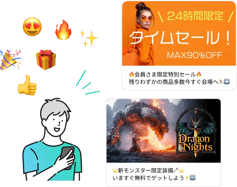 実際の商品画像や、サービスのバナーなど、顧客の目を引くリッチプッシュ通知ができることでマーケティングの結果に他社とぐんと差がつきます。また絵文字を通知に利用することができれば、文字だけの通知でも、親しみのわくプッシュ通知を作成することができます。