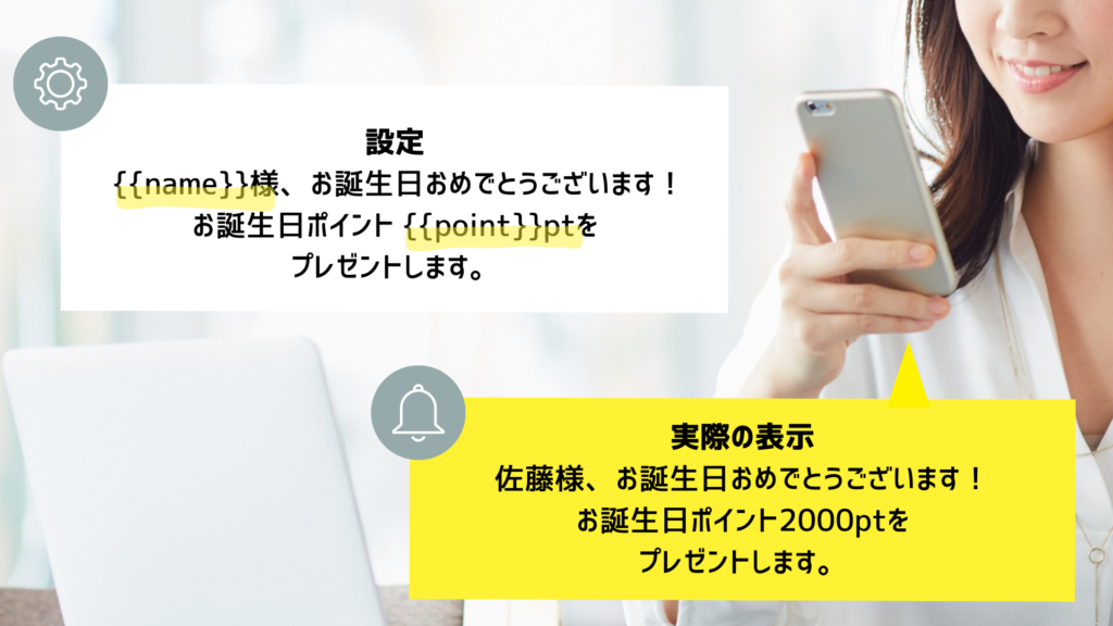 反応したユーザーを「優良顧客セグメント」に分類し、次は「差し込み文字(変数)」を使って名前入りのさらに特別なオファーを送るなど、「認知→獲得→育成(ファン化)」のサイクルを回します。